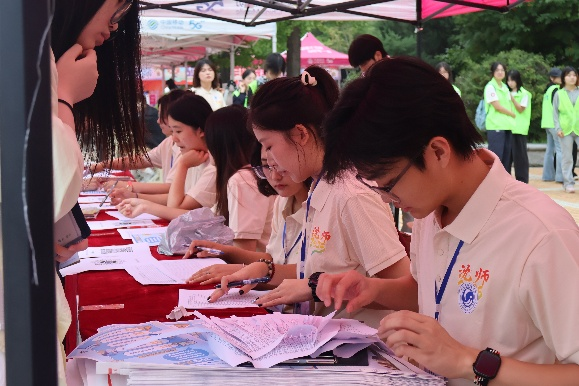 在时代广场新生报到处,各班级的助理辅导员们为他们发放校园卡和寝室条,并进行材料信息收集工作。由志愿者引领员工及其家长来到寝室,同时在路途中回答员工以及家长的各种问题,并向家长及员工进行反电诈事项宣传普及,保护员工与家长的财产安全。每一个环节都有专人负责,确保新同学能够顺利地融入新的学习生活。绿色的身影在校园中穿梭,为沈师校园注入生机活力。